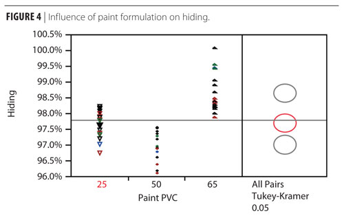 Contrast ratio (hiding) in paints is affected by PVC, level of TiO2 pigmentation, extender type, and rheology and film formation. In evaluating the data, the biggest influence on contrast ratio is the paint formulation. It should be noted that all three paints utilized the same TiO2 levels, thus increasing PVC results in creation of air voids and increased hiding. (Figure 4).