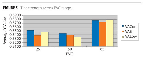 Tint strength generally correlates with the same variables as contrast ratio but is also affected by surfactant levels, particle size and many other factors. In evaluating all the paint formulations, no significant statistical differences in tint strength based on binder category were observed. On average, a 3% spread across Y value was observed for each of the different polymers evaluated (Figure 5).