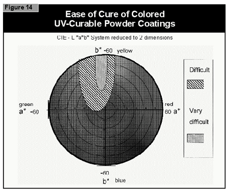 In general, the most difficult color to cure is yellow. At present, it is not possible to cure this color if a high color strength is required. In reductions with TiO2, it is possible to cure yellows at low color strength. The neighboring colors in the color space diagram (orange, brown, some greens and gray) are also difficult to cure (Figure 14).Reds and blues, however, are relatively easy to cure. Black pigments tend to have good hiding power and can be used in UV-curable powder coatings, but only at concentrations less than 1%. At 0.5% pigment concentration, a pendulum hardness of 123 was achieved. Figure 15 gives recom mendations for pigments for use in powder coatings both in reductions with TiO2 and at full shade.