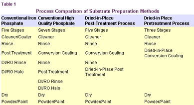 It is possible that the complexity of the entire pretreatment process can be significantly reduced with some treatment options. The use of dried-in-place (DIP) technologies to prepare substrates has made the processes less complex from both a chemical and equipment standpoint, while maintaining quality. These new systems can decrease the capital needed to construct a new system and reduce the total overall operating costs of any existing system. Table 1 shows the progression of these new technologies.These new processes are now commercially proven over a wide range of substrates and coating systems. For existing operations, current post-treatment or conversion coating tanks can be used in a recirculated method, but the tanks must be constructed of stainless steel. This means that only a small capital investment must be made to utilize this type of product. When using the recirculation method, chemical components from the previous cleaner and rinse stages, as well as components from the metal itself, may build up in the chemical process solution and cause the process solution to be dumped frequently.