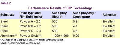 To fully realize the benefits of dried-in-place technology, it can be applied with a misting system that may require a more extensive equipment modification. The DIP technology is misted on in a controlled amount and in a very uniform manner, providing enough to completely wet out the entire surface. The excess is allowed to runoff and drain. The parts are then dried before the paint is applied. This is an ideal application of the DIP technology, and the same approach would be used in new installations. These processes have shown excellent performance with steel and aluminum. Examples of the results from commercial lines are displayed in Table 2.