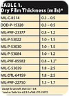 Each specification clearly states a minimum DFT requirement. For example, the exterior CARC topcoats MIL-DTL-53039 and MIL-DTL-64159 have a minimum DFT requirement of 1.8 to 2.5 mils. Not 1.0 or 1.5, but 1.8 mils. The Army knows that at 1.8 mils dry, the coating has developed its chemical agent resistance and can withstand a chemical decontamination or chemical wash without compromising its integrity. If you are applying MIL-P-53022 or MIL-P-53030, then you should know that the minimum DFT is 1.0 to 1.5 because with a properly prepared substrate per TT-C-490, the part will meet the corrosion resistance requirement. Table 1 shows a sample chart from 4.2.3.3 of MIL-DTL-53072.