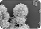 A 100,000x image showing the formation of latex polymer-pigment composites, in which Avanse latex particles are adsorbed onto the surface of a titanium dioxide particle.