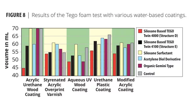 TEGO Twin 4000 (Structure D) performs quite well in all five water-based coatings systems. Similar to the previous testing in Figure 3, the additive usage level was 0.2%. As shown in Figure 8, some additive types actually contributed to more foaming than occurred in the control, which had no additive at all. This once again illustrates the need for a multifunctional additive that not only lowers static surface tension but also possesses a defoaming to foam-neutral mechanism. Although the siloxane based multifunctional additive TEGO Twin 4100 (Structure E) possessed slightly weaker defoaming ability, it was either foam-neutral or foam-stabilizing in all coatings systems tested.
