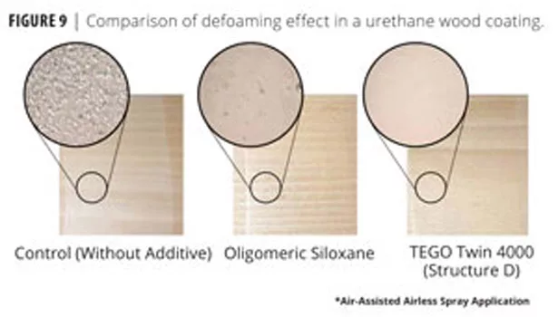Figure 9 compares the defoaming effect of the Twin 4000 (Structure D) compared to an oligomeric siloxane in a urethane wood coating spray application.