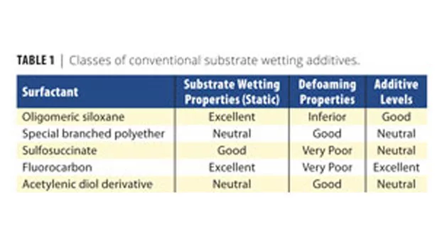 Many different technologies5,6 are used to supply the coating and ink industries with effective substrate wetting additives. As seen in Table 1, different property profiles make the various classes more or less suitable for diverse applications.