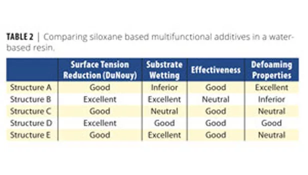 The tested siloxane based multifunctional additives each combine very high surface activity, good substrate wetting and effective defoaming in one molecule. It is most promising for water-based formulations that would normally require both a substrate wetting additive and a defoamer. The testing isolated two unique molecules that provide a multifunctional, “two-in-one” property profile. TEGO Twin 4000 (Structure D) provides both good substrate wetting and high defoaming efficiency. TEGO Twin 4100 provides superior substrate wetting while creating a defoaming or foam-neutral environment.
