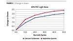 The QUV showed that the nepheline syenite had a color change early and then leveled off with the calcium carbonates with more even weathering. Given the conditions, these data are very close and do not support the expectation of large differences between these two minerals used in this mode.