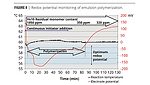 Recent developments in redox potential measurement probes now enable better control of the addition rate of redox chemicals and provide insight into reaction time optimization. As can be seen in Figure 8, the redox potential (red line) goes from negative to positive as the polymerization progresses. In this model reaction, the redox addition rate is controlled to maintain 60 °C tank temperature, providing an overall uniform, fast polymerization rate. As the redox potential reaches positive, it indicates the polymerization has essentially reached completion. Further reactor time is unnecessary, demonstrating that redox potential monitoring can improve productivity.