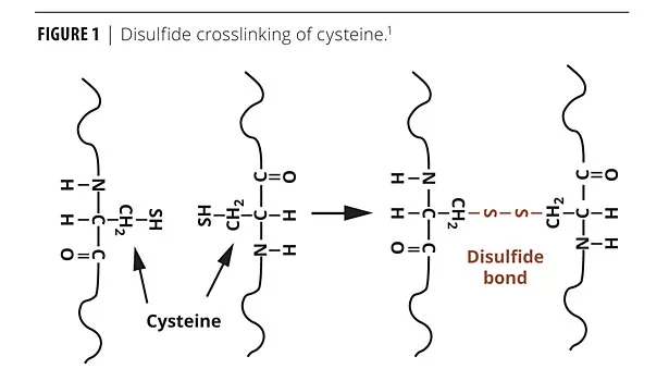 The third type of UV curing involves the use of thiol chemistry. This is the type of curing most relevant to this article. With the addition of UV light and optionally another photoinitiator, hydrogens are removed from S-H functionalities. At this point, a sulfur-containing charged species is formed. This species may attack a double bond, a process known as thiol-ene coupling. It may also bond with another sulfur, forming an S-S bond. Both of these processes are discussed in this article. When acting purely as a photoinitiator, we can expect a sulfur-containing charged species to act upon a double bond. When dealing with the formation of a self-photoinitiating film formed by proteins, S-S bonds will form. The S-H functionalities in proteins are found on the amino acid cysteine. Disulfide bonding of cysteine is shown in Figure 1.