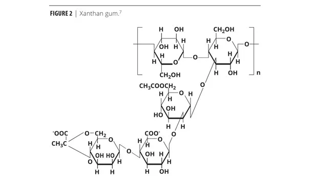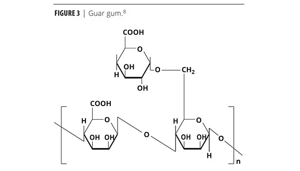 Water-resistant coatings were developed using the protein mix, a mild acid and natural gums. Natural gums such as guar and xanthan gum are often used as thickeners (Figures 2 and 3). This process may be accomplished because many gums have OH functionalities that enable them to form hydro-colloids. Water is held at the surface, allowing foodstuffs such as sauces and gravies to thicken. Although usage of gums in this way has historically been more popular in commercial production than with the home cook, the recent popularity of “molecular gastronomy” has seen gums making their way into many home and restaurant kitchens. Thus they are now fairly common items. Another important usage of gums, particularly xanthan gum, has been in the addition to baked goods that do not contain gluten. Yeast-raised baked goods without gluten are very difficult to make without these additions because they are missing the long elastic strings of protein that trap the carbon dioxide produced by fermentation. Gums aid in the development of a suitable gas barrier so that the bread may rise. When used in protein film-forming coatings the gums may act in at least two ways. One is to loosely bond to water to spread it out at the surface of the coating instead of passing through it. The other is to provide actual barrier qualities.