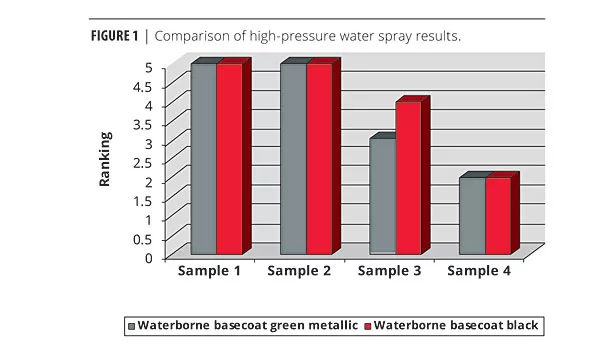 The applied systems, based on two different basecoats, were tested for high-pressure water spray as per the SAAB method. It is essential to evaluate adhesion properties with different extender combinations, especially combinations with platy structures.