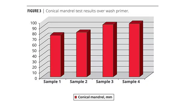 The samples were checked for elastic properties (primer alone) after 7 days curing at room temperature. The experiments were carried out over bare mild steel substrate and over wash primer. The results of the conical mandrel (ISO 6860) test are shown in Figures 2 and 3. Note: Length of cracking is measured in mm, for the conical mandrel test. The lesser the unit, the better the flexibility.