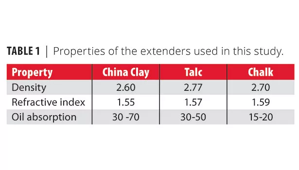 Table 1 shows the properties of the different types of extenders used in this study. China clay/kaolin is a clay material with a platy structure; its chemical composition is Al2Si2O5(OH)4. Talc (Mg3Si4O10(OH)2 is hydrated magnesium silicate and exhibits useful flatting and anti-settling properties. Platy talcs improve the toughness and durability of paint films. Calcium carbonate, sometimes called chalk (CaCO3), exhibits good flatting properties.