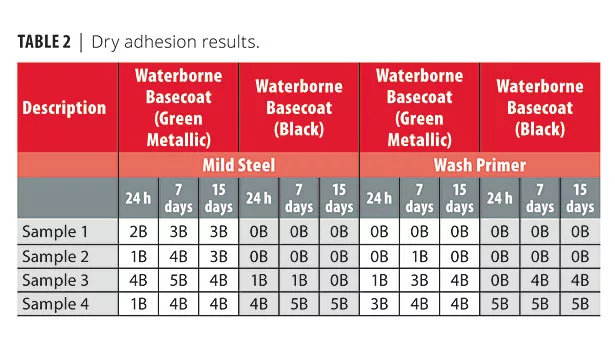 All the experimental undercoats were applied directly over a mild steel substrate as well as over wash primer, and the same were sanded after sitting overnight. Then two different waterborne basecoats were applied over the scuffed, smooth surface, followed by application of a solventborne clearcoat. The applied systems were tested for adhesion after 24 h, 7 days and 15 days. The adhesion was judged on a scale of 0B-5B, where 5B = no failure; 4B = 0-5% failure; 3B = 5-15% failure; 2B = 25-35% failure; 1B = 35-65% failure and 0B = above 65% failure. Table 2 shows the adhesion results.