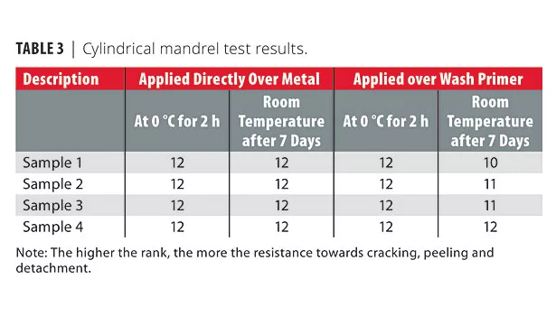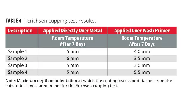 Table 3 shows the results of the cylindrical mandrel test (ISO 1519). Table 4 shows the results of the Erichsen cupping test (ISO 1520).