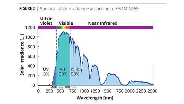 It is commonly known that when placed in natural sunlight, a white surface remains cool, whereas a black one heats up. The cause is due to the contact of the coated surface of the substrate with the near-infrared radiation (NIR) emitted by the sun. When radiation is absorbed, light is physically converted into heat. The sun emits over 50% of its energy as NIR radiation (Figure 2). By using a conventional pigment, this effect could result in a build-up of solar heat due to the unwanted absorption of radiation from the sun. The shelf life of a material or substrate increases by protecting it from damage caused by solar heat build.