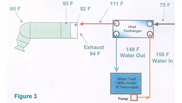 The system employs a small water-to-air heat exchanger (3” x 8”) that can be mounted on the same arm as the bell, shortening the distance that the warm compressed air travels to just 18” – 24”. A specialized coating both insulates the HX and limits dirt build-up, making it easy to clean. A small temperature control unit (TCU) comprised of a reservoir, heater, pump, and controller is located outside the booth in a non-explosion-proof area. This both regulates the water temperature and circulates it through the heat exchanger. In this configuration, the air is heated just prior to entering the bell and raises the surface temperatures of the bell, as shown in Figure 3.