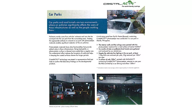 Research shows that photocatalytic surfaces, either outdoor or indoor, can significantly decrease the pollutants present in the air, reducing the negative effects that those compounds have on health. The self-cleaning performance of photocatalytic surfaces contributes to reduce the maintenance costs (cleaning, repainting, etc.), while photodegradation of pollutants also results in cost savings (lower energy demand for air recirculation in polluted areas, such as car parks). Cristal developed and patented proprietary coating formulations to enhance the performance of CristalACTiV™ TiO2 photocatalysts.