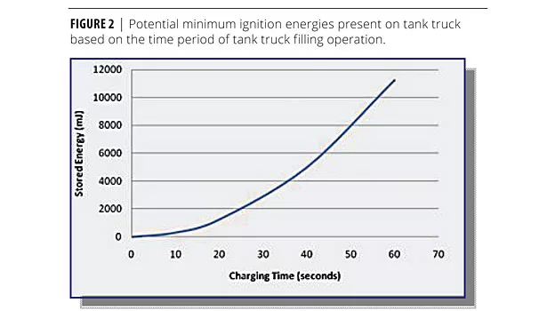 Over a short time period (less than 20 seconds), potentials in excess of 50,000 volts can be induced on a tank truck’s container when it is being filled at normal flow rates with a product that is electrostatically charged. The magnitude of the voltage induced is directly proportional to the quantity of charges making contact with the container. This voltage represents the ignition source and the potential energy available for discharge via a static spark. For a typical truck a typical discharge at voltage levels of 50 kV can occur with energy levels in excess of 1250 mJ. The vast majority of flammable vapors and combustible dusts can be ignited at these energy levels.
