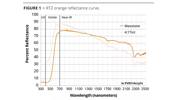 The closest standard CICP yellow to RTZ pigments are chrome titanates (PBr24), which are the workhorse red-shade yellow pigments for demanding applications. RTZ pigments have a more chromatic masstone and tint than standard PBr24 colorants. This chromaticity of RTZ Orange can be seen in the reflectance curves, with the steep rise of the curves giving the pigment a very high chromaticity and excellent red value (Figure 1).