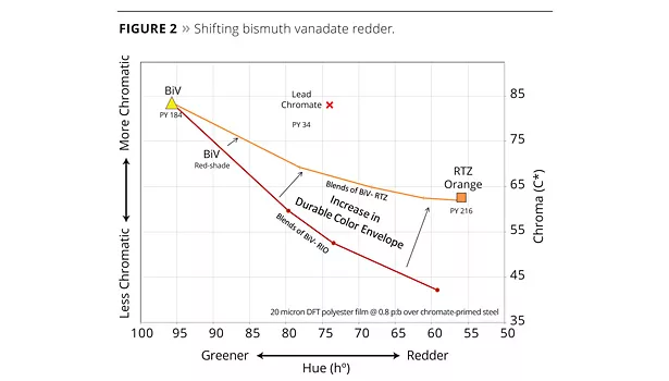 The RTZ pigment’s increased chromaticity makes it an excellent replacement for color matches containing PBr24 and organics, and allows for an increase in the color space that is achievable with standard colored titanates. RTZ orange also makes an excellent pigment to blend with organic pigments to improve opacity and weathering. Another interesting use for RTZ orange is in blends with bismuth vanadate (PY184) to shift them from green-shade to redder-shade yellows. Red iron oxide (Red 101) can be used to affect the same color shift but, as can be seen in Figure 2, the RTZ orange better preserves the chromaticity of these blends. Starting on the left-hand side of the plot, the line labeled “BiV-RTZ Blends” demonstrates how this approach produces more chromatic colors than the “BiV-RIO” line. Organic pigments could also be used to affect this color shift in PY184 pigments, but using an RTZ pigment keeps all the components inorganic with better opacity and durability potential. The RTZ orange pushes the edge of the durable color envelope.