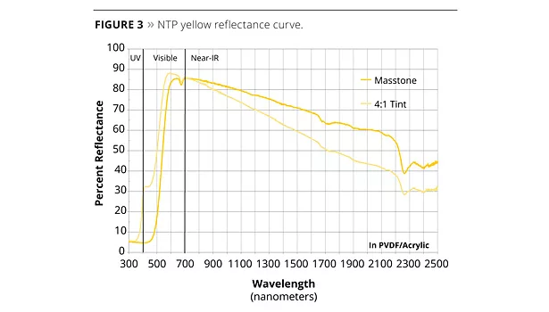 NTP yellow exhibits excellent temperature stability, low resin demand and surface area, fine particle size, ease of dispersion and generally desirable pigmentary properties. The key to its color can be seen in a graph of its reflectance curve (Figure 3).