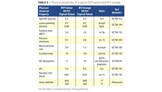 The most relevant intellectual property is U.S. Patent 8,192,541, including other patents, invented by Dr. Simon Boocock of the Shepherd Color Company.3 These pigments have the general formula of: Sn2Nb2O7. The physical properties of a typical NTP yellow and RTZ orange are shown in Table 2.