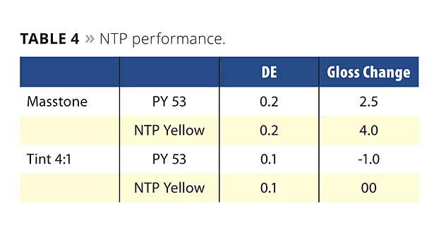 The NTP yellow pigment shows excellent resistance to acids and bases. When incorporated in a coating resin system and exposed in the periodic Kesternich acid stability test, the NTP yellow shows similar performance to workhorse pigments like PY53 (Table 4).