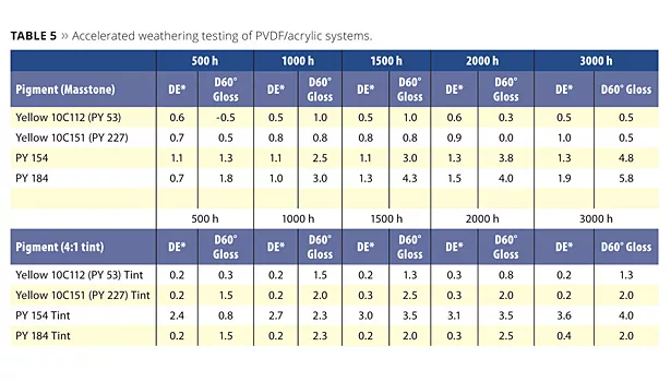 This stability is also shown in accelerated weathering testing. The PVDF/acrylic-based systems are very hard on pigments due to the high UV transparency of the resin system. As can be seen in Table 5, the NTP yellow has excellent color and gloss retention in accelerated weathering testing in a PVDF/acrylic system in both masstone and tint when compared to alternatives. The organic pigment PY154, which is close to the NTP Yellow 10C151 in chroma and hue, suffers degradation in a tint, while the inorganic pigments do well in the tint.
