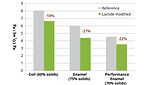 Impact resistance of lactide-modified polyester coatings, as well as adhesion on metal substrates for coil- and performance-enamel coatings, were maintained compared to the reference coatings. Adhesion on metal substrates for the enamel polyester coating was significantly improved, versus reference (Figure 9). Adhesion was improved because of the more polar structure of the polymer created by the incorporation of lactide. The chemical and stain resistance for all lactide-modified polyester coatings showed comparable results. Furthermore, modification of the enamel coating with lactide exhibited a comparable outdoor behavior compared to the reference coating (Figure 10). The outdoor stability of the enamel coating during 1000 h is comparable to exposure to the Northern European climate for 1 year.