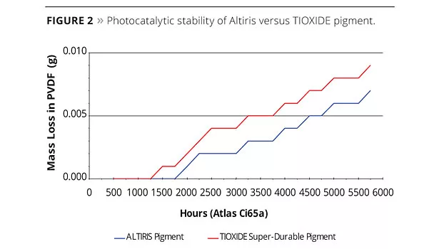 - To enhance the photocatalytic stability of the novel pigment, a dense silica coating has been applied for durability. The coating acts like a protective shell around the pigment particles, helping prevent escape of charged species from the TiO2 and consequent creation of harmful radicals within the resin. The increased photocatalytic stability of the pigment was demonstrated using a durable alkyd melamine formaldehyde paint system, which tests durability with particular emphasis on the photocatalytic aspect of the pigment. These results are shown in Figure 2.