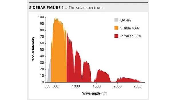 The ALTIRIS pigment project began in 2007. A multi-disciplinary project team was formed to evaluate the market potential and to establish the technical feasibility of the concept. Titanium dioxide pigment is traditionally optimized for reflection in the visible spectrum. To keep colored surfaces cool in the sun, it is critical that they reflect the invisible part of the solar spectrum, the near infrared (IR), as this is what generates the most heat (Sidebar Figure 1). In order to create a solar-reflecting pigment, the Huntsman team had to shift the main reflection band of titanium dioxide into the near-infrared region of the solar spectrum. It was also necessary to diminish the traditional whiteness of the product – enabling customers to develop dark and vibrant solar-reflective colors. Senior research scientists developed light-scattering models to define a titanium dioxide pigment with near-infrared-reflecting properties. |