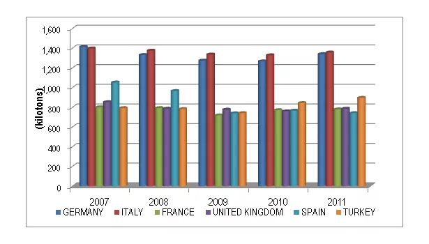 Comparison of European top five countries and Turkey – sales of decorative paints 2007-2011.