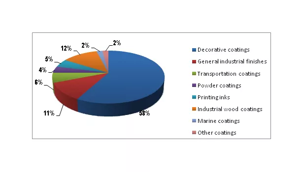 Inthe Turkish market, per capita coatings consumption is 11 kg/head (population 78.8 million). The coatings market segments (by tonnage) are: 58% decorative coatings (494,000 metric tons), 12% industrial wood coatings (102,000 metric tons), 11% general industrial finishes (93,000 metric tons), 6% transportation coatings, 4% powder coatings (34,000 metric tons), 5% printing inks (43,000 metric tons), 2% marine coatings (for 17,000 metric tons) and 2% other coatings (17,000 metric tons). Wood coatings represent the second largest market share with 12%.