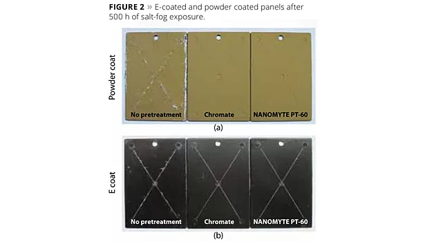 In addition to conventional liquid primers, powdered plastic resin (powder coat) and electrodeposited (e-coat) primer were also applied on the conversion coatings to measure the corrosion resistance of the coating system. Figure 2 compares the performance of tan powder coated panels and e-coated (black epoxy) primer panels after 500 h of exposure in the salt spray environment following the ASTM B117 standard protocol.