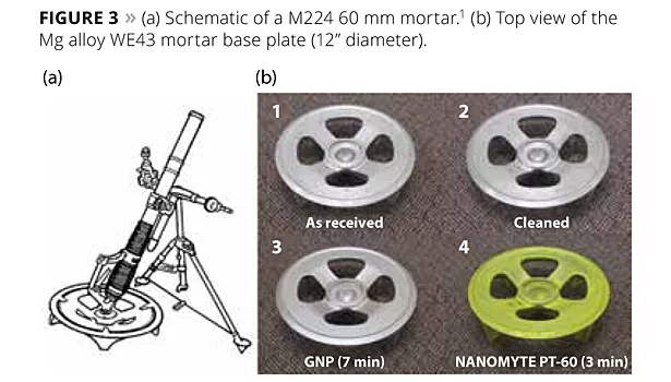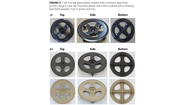 Recently, NEI has worked with the U.S. Army Armament Research Development and Engineering Center (ARDEC) at Picatinny Arsenal, NJ, to successfully demonstrate the effectiveness of PT-60. NEI coated two magnesium base plates for a M224 60 mm light mortar application. The prototypes were made at Picatinny Arsenal, cut from the alloy Mg WE43. This was the first time PT-60 was applied on this alloy (Figure 3). Following the PT-60 treatment, an epoxy e-coat and then a powder coat were put on for prototype feasibility purposes (Figure 4). This effort addresses the need for the development of chromate‐free coating systems for lightweight alloys to be used in weapon systems for the warfighter.