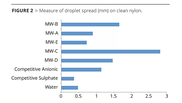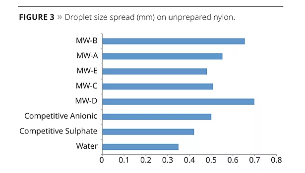 In contrast to the results of droplet spread on clean nylon, the data in Figure 3 shows a different range of the MW series yielding a larger spreading effect when unprepared nylon is the test substrate. In this case, MW-A, MW-B and MW-D are the leading spreading agents. This data does correspond to data in Table 1, as these are the three materials with the lowest CMC. The ability of these three materials to form micelles at very low concentrations could indicate possible emulsification of the impurities on the substrate.