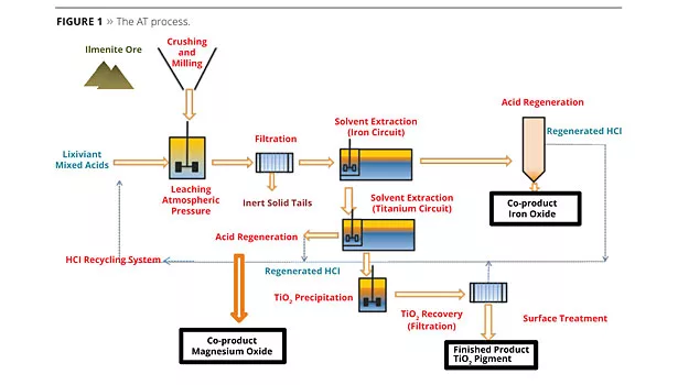 During the AT process, ilmenite ore is leached by acids, followed by a first solvent extraction to remove iron, and then a second solvent extraction to remove TiOCl2 and to achieve a clear solution containing titanium. A hydrolysis onto this clear solution, without impurities and contaminants, will result in pure TiO2. The pigment washing steps in the AT process are easier and more efficient compared to the sulfate process (Figure 1).