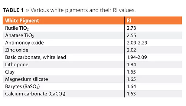 As a pigment, TiO2 is dispersed in various matrices in order to allow scattering and reflection of visible light. For many years, different substances, characterized by their Refractive Index (RI), have been used to achieve light reflection – the higher the RI, the higher the reflection. TiO2 has the highest RI among white pigments typically used in industry (Table 1). The scattering of visible light gives TiO2 its most important optical properties, including opacity, brightness, gloss, tone (white) and undertone (color), lightening power (tinting strength), weather resistance, durability and abrasiveness.
