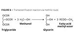 The transesterification consists of the chemical reaction between plant or animal oil (triglyceride) and alcohol (methanol or ethanol) aided by catalysts. The reaction products are methyl or ethyl fatty acid esters and glycerin. At the end of the process, the catalyst is removed through the reaction with hydrochloric acid. Figure 6 shows the transesterification reaction through methilic routes.12