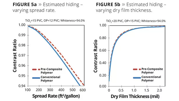 As noted, application properties are as important as intrinsic hiding properties when seeking to maximize applied hiding. Within this subset, spread rate is a key variable. Spread rates of 450 square feet per gallon are typically recommended, but in real-world application, these will vary greatly, in some cases by as much as an order of magnitude due to the substrate texture and the pattern developed by the applicator tool. Figure 5a demonstrates the relationship between intrinsic hiding and spread rate, with contrast ratio increasing as spread rate decreases. At all measured spread rates, paints formulated with pre-composite polymer (dashed red line) offer consistently higher intrinsic hiding than paints made with conventional polymer (solid blue line). Maximum optimization is represented by a combination of increased intrinsic hide and decreased spread rate.