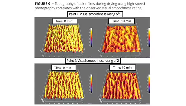 Time lapse imagery was used to understand how the surface roughness changes as paint films dry. This image method was developed for two reasons: 1) it is a faster method to understand the topography of a dried paint film than profilometry and 2) it allowed analysis of the changing topography of the film as it dried. Figure 9 are pictures of dried paint films using image analysis showing the difference in pattern uniformity over a period of 10 min of drying at 72 ?F. How the topography of the film changes, or doesn’t change, strongly influences how the dried film will appear. These two paints have very rough surfaces at time zero, but paint 1 shows a significantly smoother film at 10 min after application. These image results clearly demonstrate that the initial pattern created by the roller cover is not necessarily the final pattern observed when the film is dry.