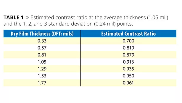 The distribution of film thickness determines the roller pattern and, ultimately, what the consumer will see as surface smoothness and applied hiding. The ideal distribution of film thickness for maximized applied hiding would be one where even the thinnest film would deliver a contrast ratio of 0.98 or greater. Table 1 shows the estimated contrast ratio for the dried film thickness distribution shown in Figure 8, where the measured S/mil is 5.0, the paint was not toned retaining a Y reflectance of 94% and the volume solids is 38%. Note the dramatic decrease in hiding as thickness decreases, as shown in Figure 5b. The estimated contrast ratios for different applications are shown in Table 2. Recommended spread rate, typical laboratory draw down and rollout tend to trend to thinner films and thus, lower hiding. For roller application, hiding is further lowered due to the pattern introducing thin spots.