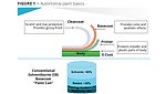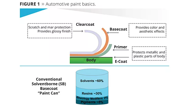 A conventional automotive coating consists of four layers: electrocoat, primer (a.k.a. surfacer), basecoat and clearcoat. Each layer serves a purpose (Figure 1), and each has unique formulations. For example, the basecoat formulation consists of solvent, resins, rheology modifiers, pigments and other additives. Solvent can include organics and/or water. One should note that current WB coatings do contain at least some organic solvents with typical solvent content ranging from 10-16%8 by weight in a WB basecoat formulation. The primer and basecoat layers may be either SB or WB. The vast majority of clearcoats are currently SB, and are available in 1K or 2K resin chemistries.