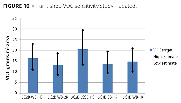 A sensitivity study was performed to investigate how the VOC performance would change by varying film build, paint VOC content and % solids according to the values in Table 3. A case study was also performed for completely eliminating VOC abatement for all scenarios. The sensitivity results are shown in Figures 10 and 11. Figure 10 shows the abated case, which is the default basis for the LCA. The blue bars correspond to the totals shown in Figure 9 for target conditions from Table 3. The black dots show the expected minimum and maximum VOC emissions achieved by varying film build, % solids and paint VOC content. The lower dot represents the highest solids coating applied at the lowest expected film build from Table 3. The higher dot represents the lowest solids coating applied at the highest expected film build from Table 3, thus attempting to encompass a normal range of expected VOC emissions for each scenario.