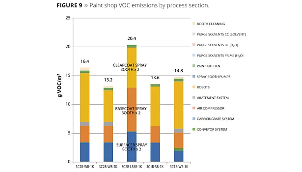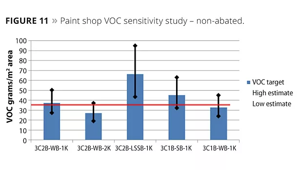 The paint shop VOC emissions are shown in Figure 9 for target material and application conditions. Each of the technology scenarios modeled by IHS is based on standard shop designs including abatement systems. All scenarios can meet the European limit of 35 g VOC/m2 with full abatement of solventborne spray zones and ovens. The capture and destruction efficiency of the VOC emissions varies based on the complexity of the booth air flow for the scenario.