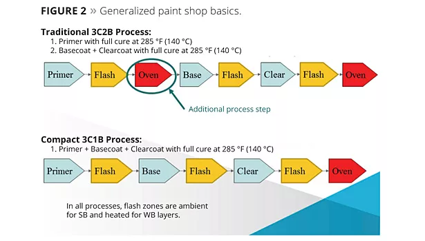 In more recent years, modern paint shops began moving towards compact paint processes – available in high-solids solventborne (HSSB) and WB configurations. Compact paint processes are claimed to provide significant reductions in energy consumption relative to conventional SB and WB processes.