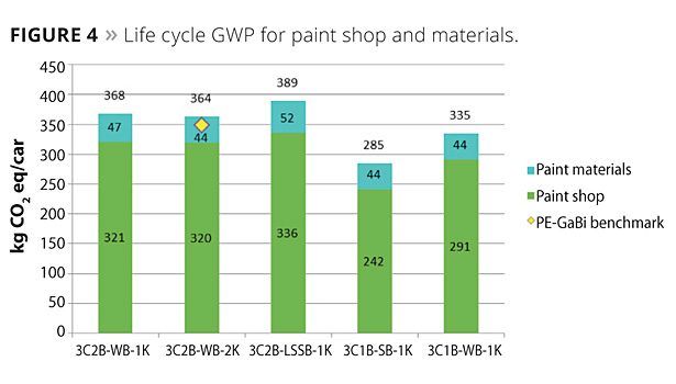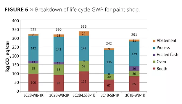 This study supports the position that modern compact high-solids automotive OEM paint technology can achieve the lowest GWP, while meeting European VOC emission limits. High-solids SB compact processes can outperform the life cycle GWP impacts of the WB compact process due to lower spray booth energy usage and the elimination of the heated flash zones. The life cycle GWP impacts of automotive coatings are dominated by the paint shop energy usage. The GWP impacts due to paint material production are less significant.