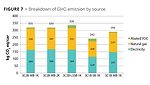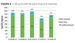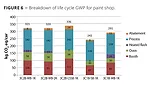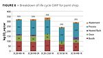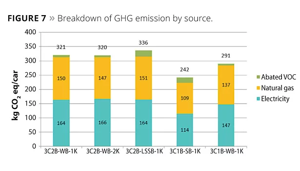 Figure 7 shows the breakdown of GWP impact by energy source. The GWP associated with the paint shop is primarily due to on-site combustion of natural gas and off-site electricity generation. The on-site combustion of VOC in the abatement equipment has a small contribution.